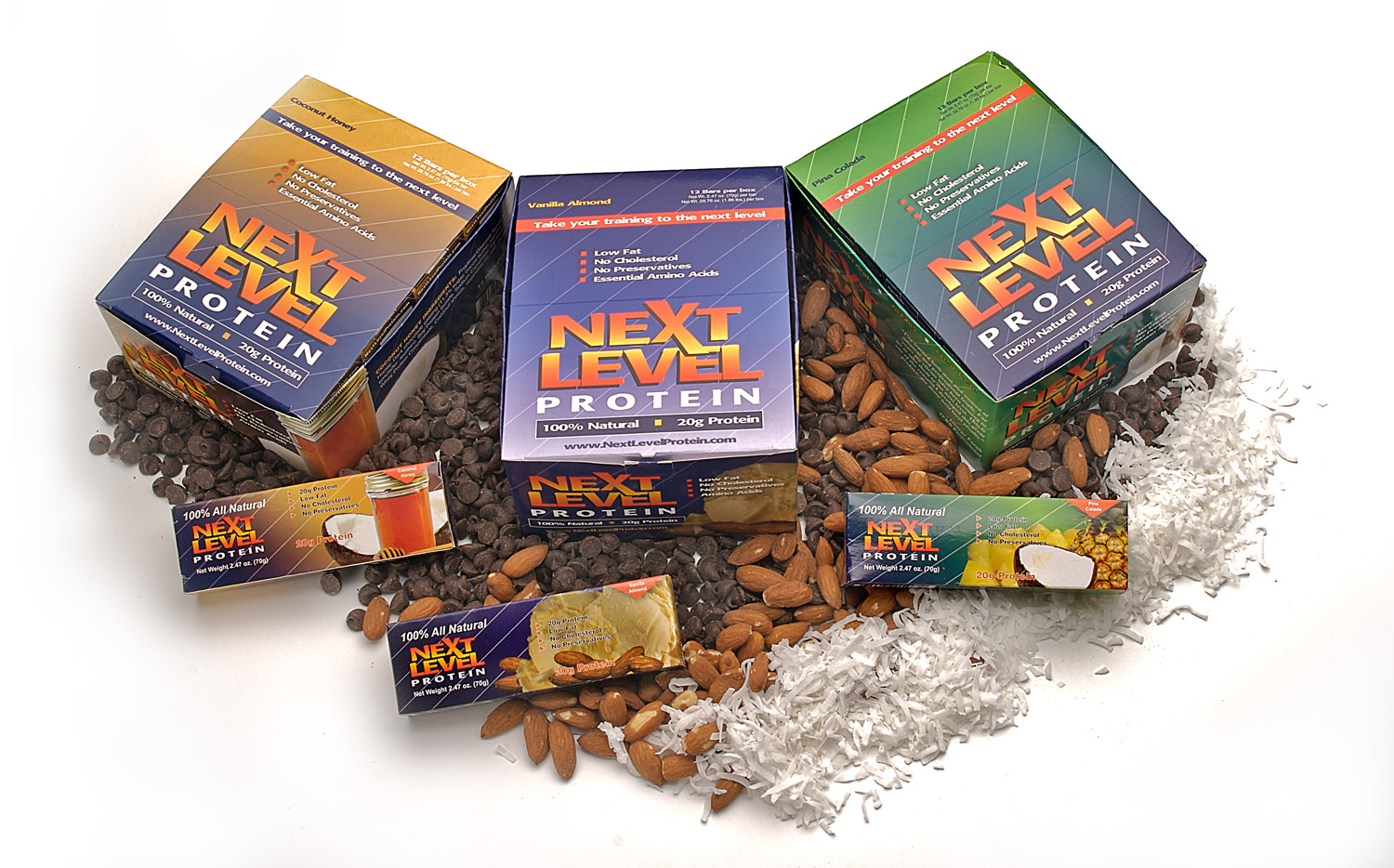 Packaging Design - Next Level protein bars in vanilla nut, honey and pina colada flavors.